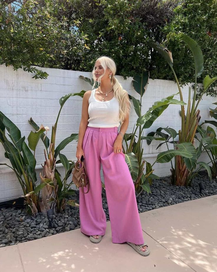 Lastly, a scene set against a modern Palm Springs home showcases a palm springs outfit plus size in a confident light. The wide-legged pastel pants paired with a fitted white tank top radiate an air of effortless chic that is both inclusive and inspiring.