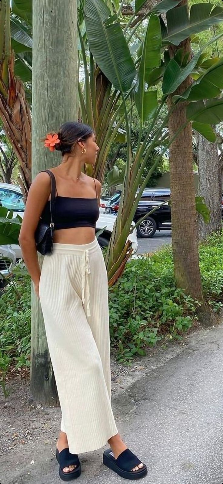 In the lush greenery of Palm Springs’ exotic flora, a black crop top with wide-legged cream pants paints a picture of tropical elegance. The addition of a bold flower accessory hints at a palm springs outfit ideas winter, where the climate allows for year-round playfulness in dressing.