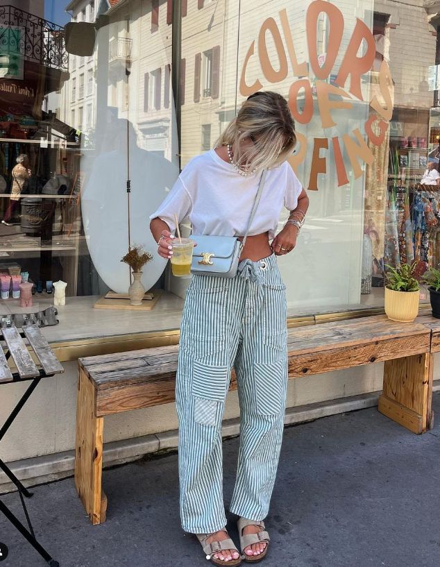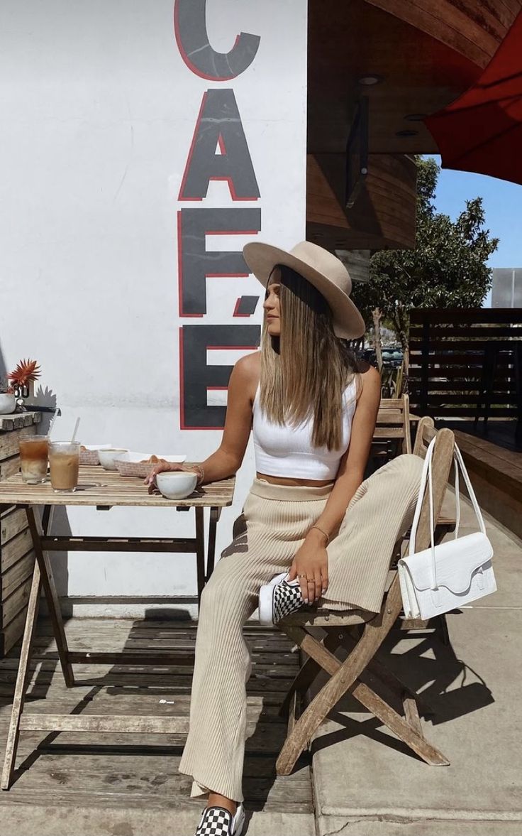 This image exudes a Palm Springs outfit february vibe, with its earth-toned palette mirroring the desert’s natural colors. A white crop top and beige striped pants paired with a wide-brimmed hat create a harmonious blend of comfort and style, perfect for a coffee date or a leisurely walk through downtown galleries.