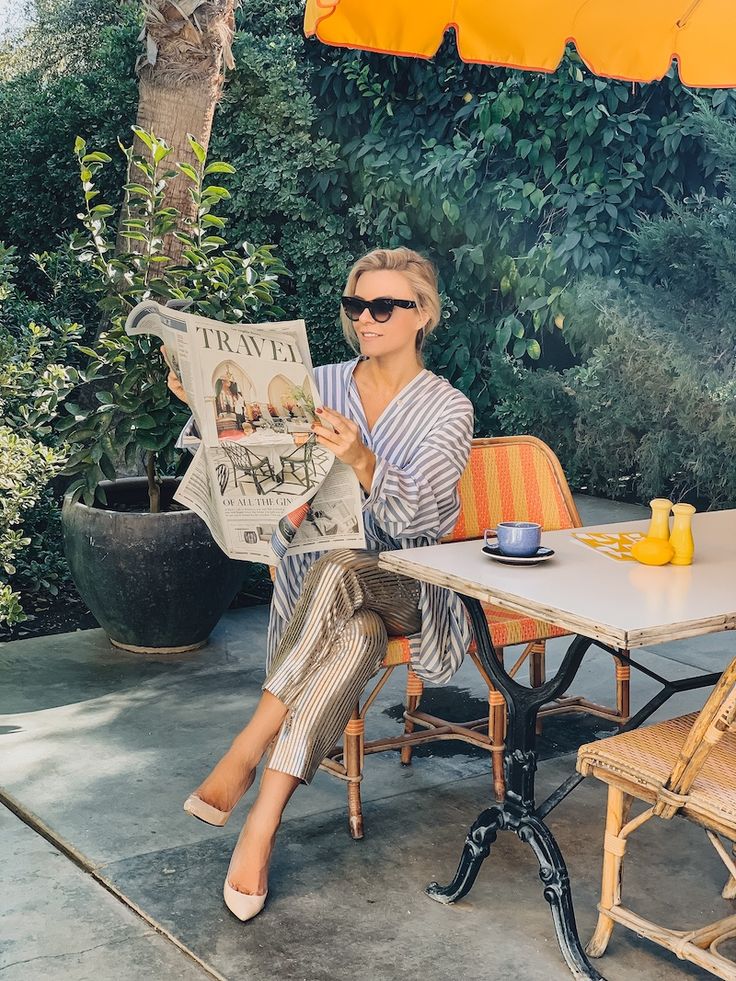 As the soft morning light filters through Palm Springs’ canopies, a striped robe offers a chic transition from repose to the day’s adventures. Pictured here is an ensemble perfect for a palm springs outfit spring morning, with a woman enjoying her coffee outdoors. Her pajama set, with its crisp stripes, offers a stylish yet comfortable option for those slow starts. Paired with understated jewelry and a morning paper, it’s the epitome of relaxed sophistication.