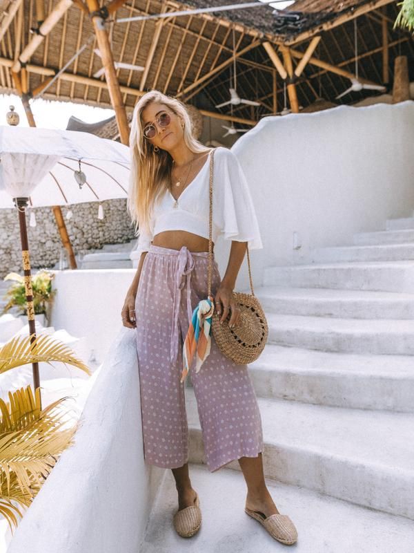 Amidst the white-washed architecture of a luxe Palm Springs resort, a relaxed yet sophisticated ensemble captivates the eye. The lilac-colored culottes adorned with a subtle polka dot pattern offer a breath of fresh air and a soft color palette that whispers of Palm Springs outfit ideas spring. The cropped white wrap top adds an air of carefree elegance, while the straw bag and espadrille shoes ensure the wearer is resort-ready.