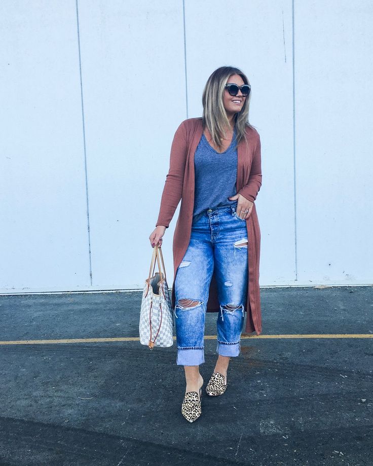 As the chilly winds of winter blow, layering becomes essential. A long, flowing cardigan over a comfortable tee with distressed jeans and statement animal print flats creates an outfit that’s both stylish and suitable for the colder months.