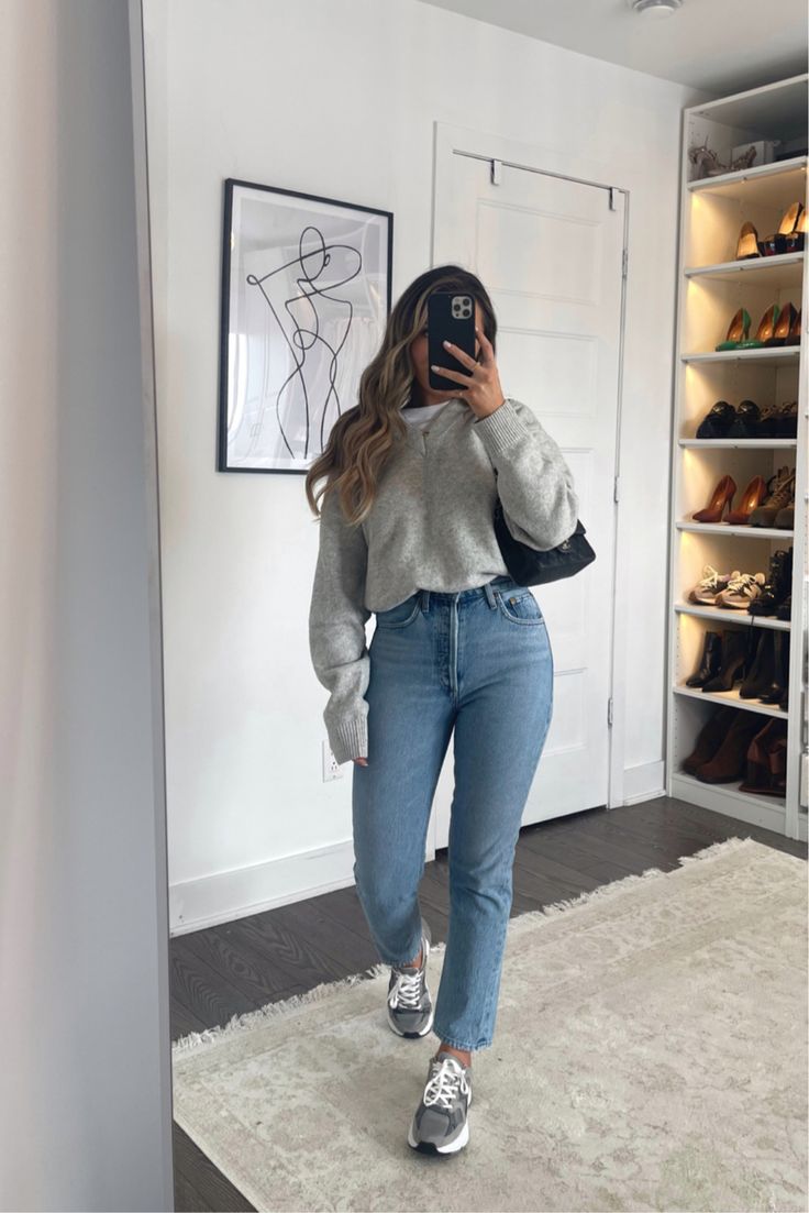 There’s something about a grey sweatshirt and jeans combo that speaks volumes about casual mom outfits. It’s the bread and butter of every day mom outfits casual, yet when paired with trendy sneakers and a touch of silver jewelry, it transcends into a look that’s effortlessly cool and collected.