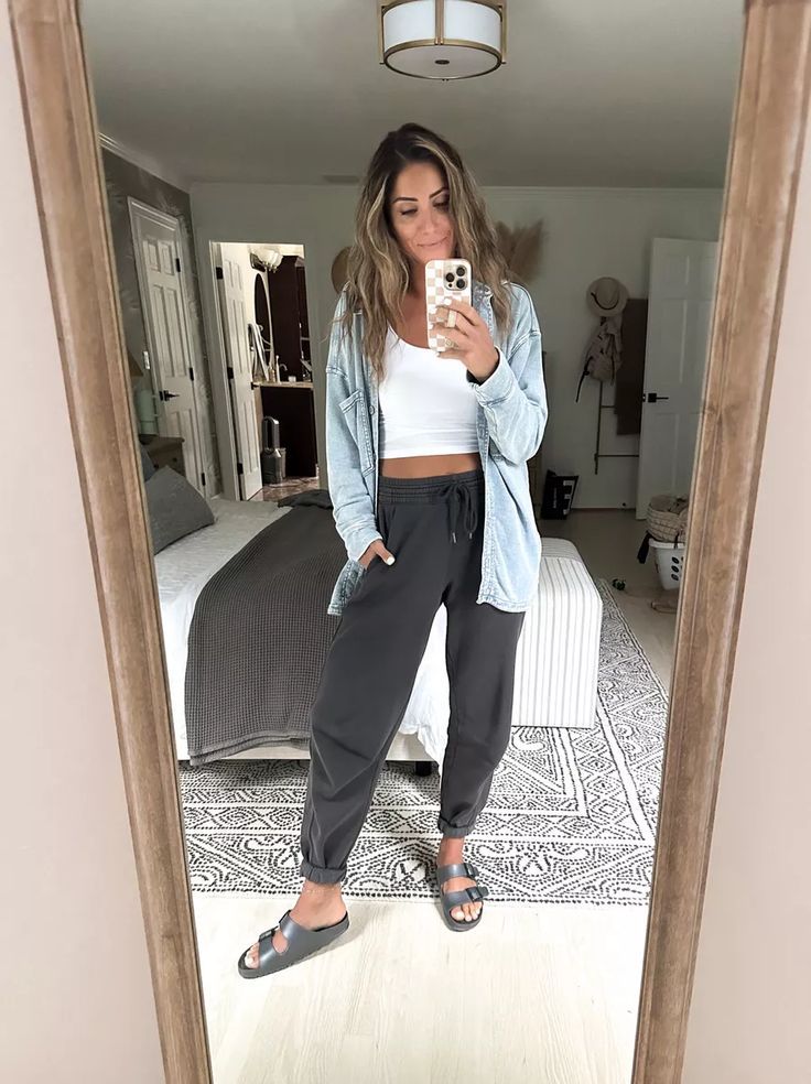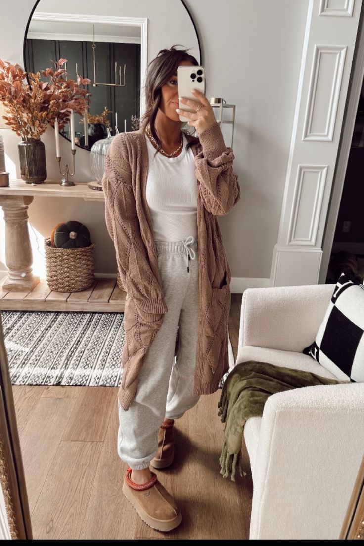 Who says loungewear can’t be luxurious? A textured long cardigan envelops a cozy white tank and soft joggers, creating a lazy day mom outfit that’s as chic as it is comfortable. Paired with soft suede footwear, it’s ideal for those homebound days that demand a touch of elegance.