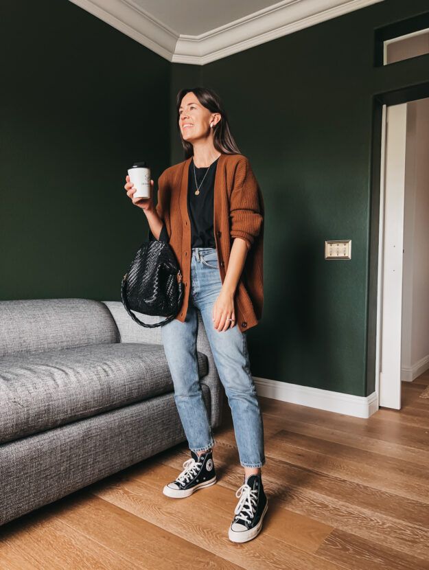Sipping on a latte never looked better with a warm, rust-hued cardigan layered over a black tee paired with light-washed jeans and classic converse. It’s the perfect blend of casual mom outfits for a rainy day or a quick catch-up with friends.
