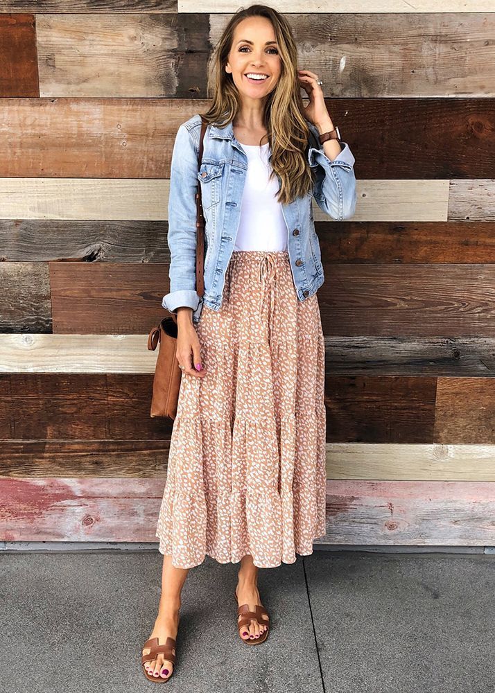 Embrace the sunny disposition of summer with a flowing floral skirt and a light denim jacket. It’s a breath of fresh air and a nod to casual yet stylish mom outfits that work for a park date or a backyard brunch.