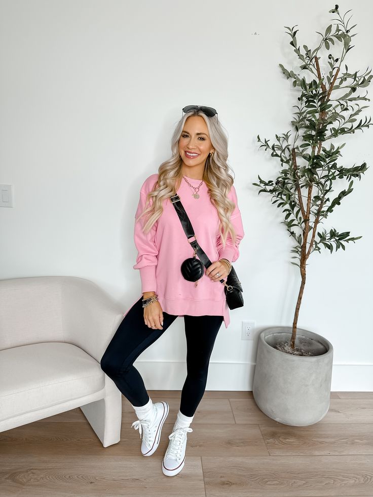 Brighten up the day with a splash of pink—a casual sweatshirt paired with sleek leggings and white sneakers. It’s a cute mom game day outfit that says you’re all about fun while keeping things stylish and sporty.
