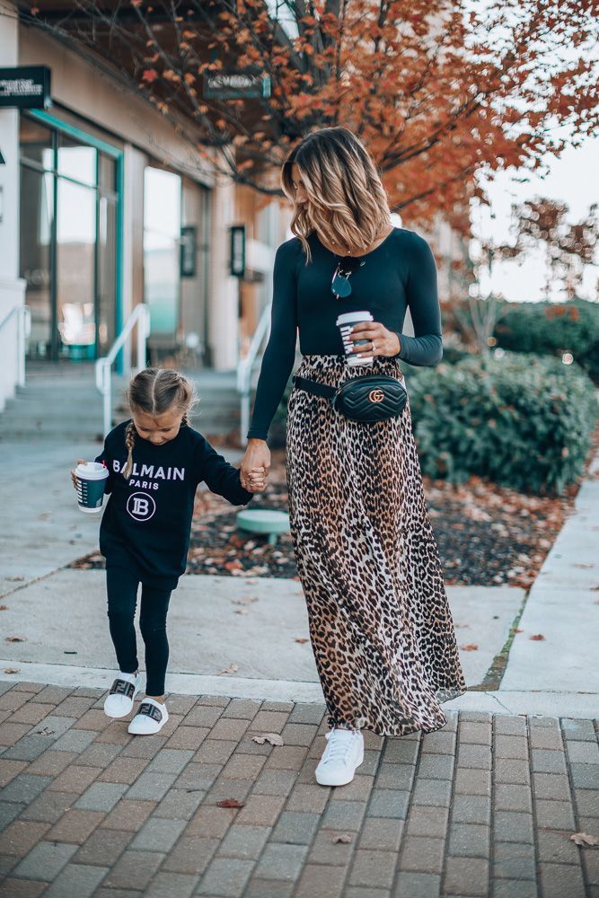Pair a sleek black top with a bold animal print skirt for a mom and son valentines day outfit that stands out. It’s playful yet poised, perfect for a special day out or a themed school event.