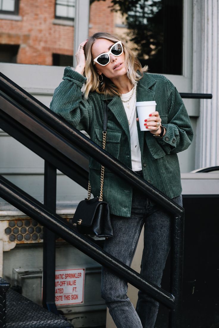 Whether it’s a parent-teacher conference or a casual business meeting, a tailored corduroy blazer over acid-washed jeans strikes the right note of professionalism without losing personal style. Accessorized with layered necklaces and a classic black handbag, it’s an outfit that commands respect while showcasing personality.