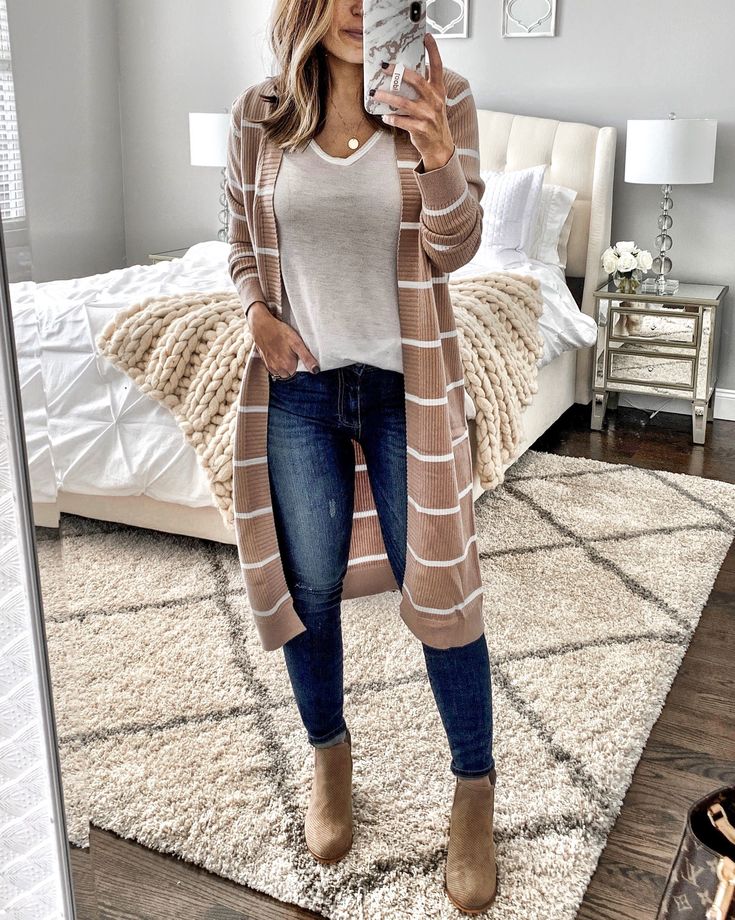 Spirit week asks for a step-up in the style game. A playful yet chic outfit like a simple white tee tucked into jeans, complemented by a longline cardigan with striped details, captures the essence of school spirit with a mature twist. It’s a nod to both fun and finesse that every day mom outfits can embody.