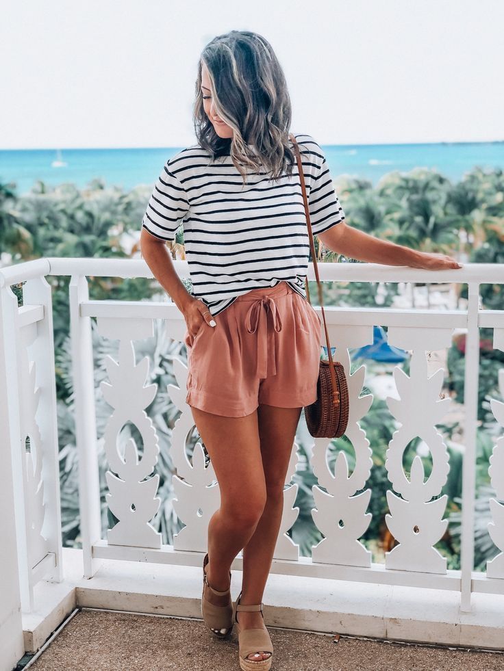 Stripes and summer have an enduring romance, depicted elegantly in this nautical-inspired outfit. The horizontally striped tee hugs the body in all the right places, paired with relaxed-fit blush shorts, making for an ensemble that’s both casual and chic.