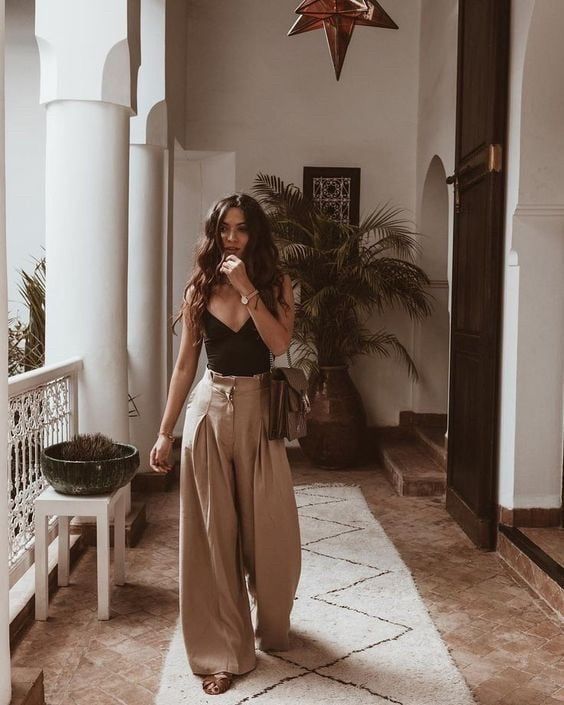 This image is a testament to the sophisticated traveler, someone who blends local culture with their personal style. The summer vacation outfit showcases a sleek black bodysuit matched with wide-legged beige trousers, embodying a blend of comfort and casual chic.