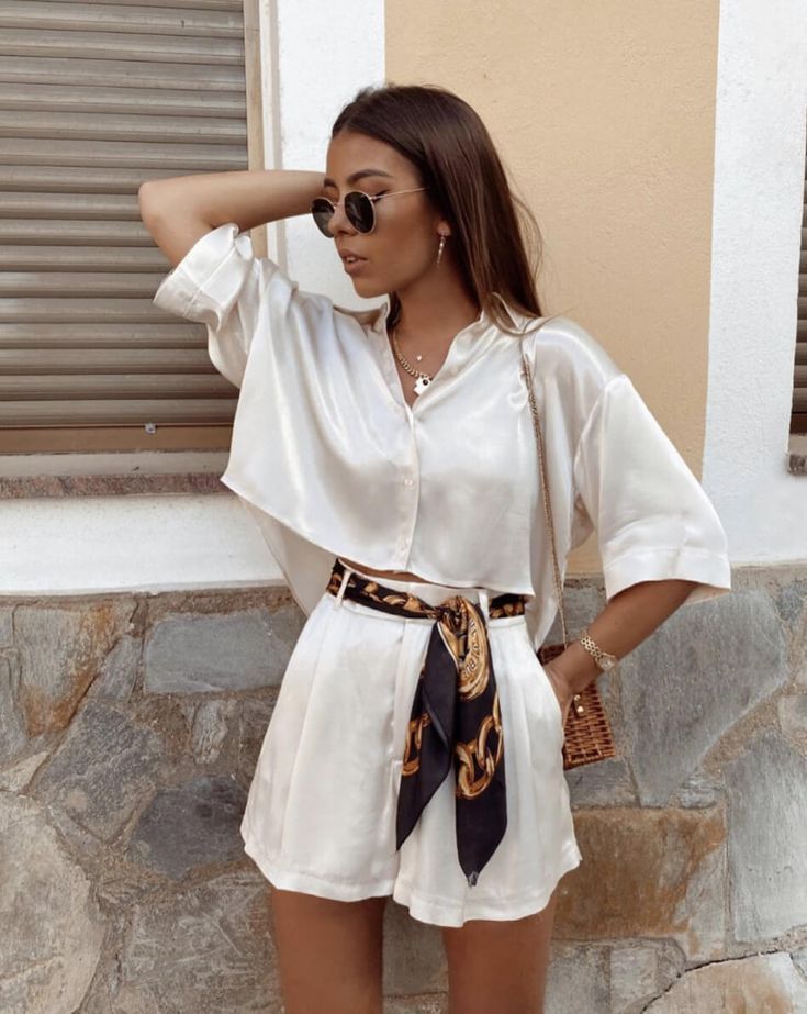 In the serene setting of a summer getaway, this outfit stands out with its monochromatic palette punctuated by golden accessories. The loose-fitting white satin shirt tucked into matching shorts creates a luxurious and breathable look, ideal for a summer vacation outfit.