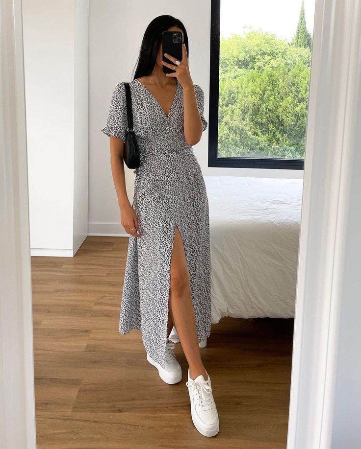 This image showcases the perfect urban summer vacation outfit, combining a flirtatious wrap dress with the comfort of sneakers. It’s a smart ensemble for a woman on the move, striking an impeccable balance between dressy and laid-back.