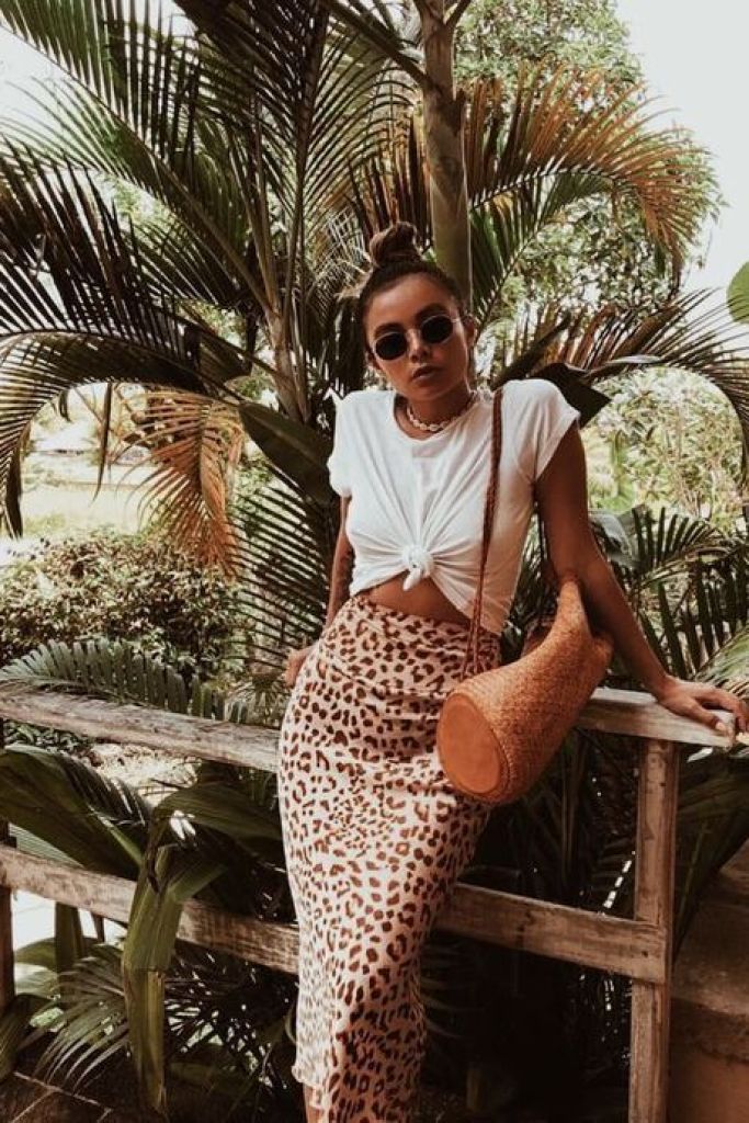 Summer vacation outfits often play with layers to create an effortless yet put-together look. The outfit showcased speaks to the modern woman who values comfort without compromising on style. A classic white knot-front tee pairs seamlessly with a leopard print maxi skirt, crafting a harmonious balance between understated and bold.