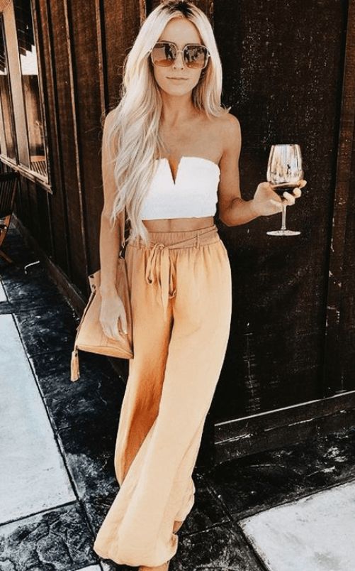 The image depicts a superbly sophisticated yet effortless look, ideal for an evening of fine dining or a chic rooftop bar during your summer escapades. The combination of a white bandeau top with high-waisted mustard trousers offers a contemporary twist on summer vacation outfits.