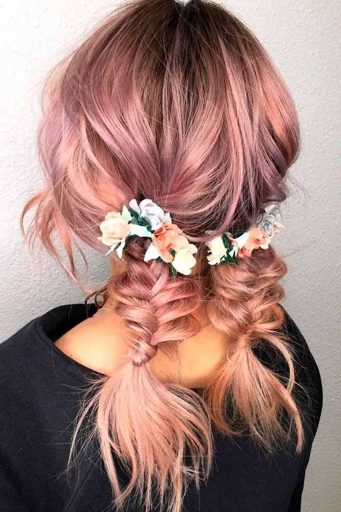 Particularly flattering for medium hair, the pastel pink color and flowers add a delightful, whimsical touch. Those with darker hair might need to pre-lighten to achieve this shade, which means extra care to maintain the hair’s health and color vibrancy.
