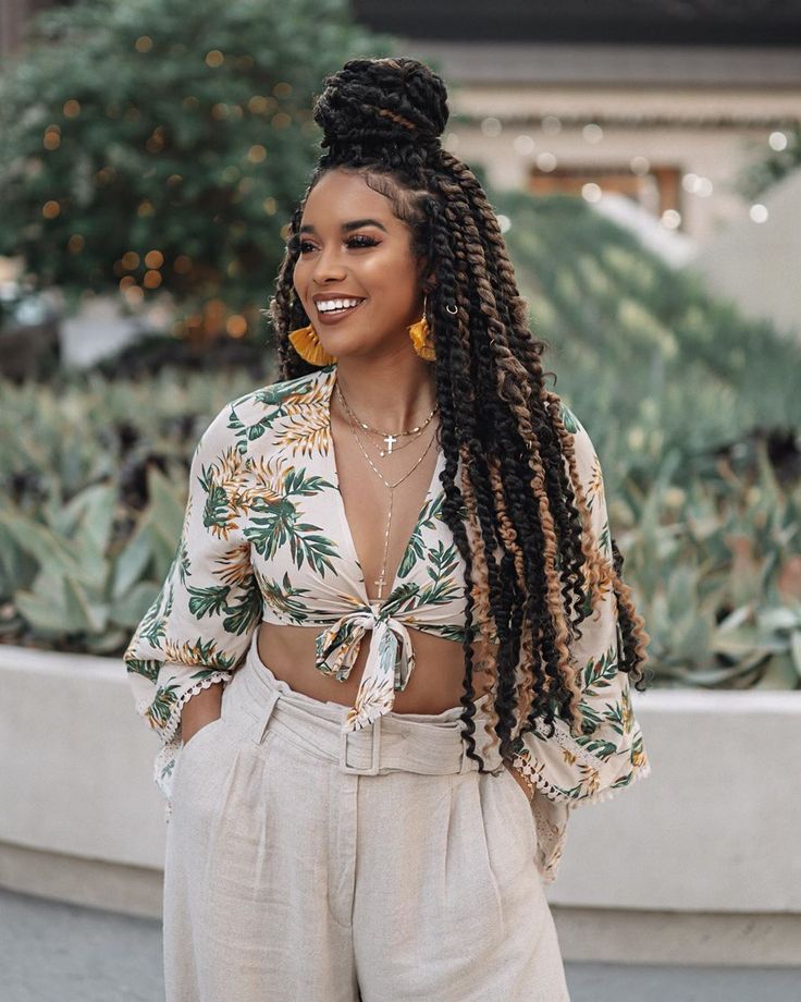 With its roots firmly twisted in an updo and its ends playfully free, this style captures the essence of spring twist hairstyles updo. The contrast of the tightly coiled roots and the free-flowing ends creates a visual harmony, ideal for a warm spring day.
