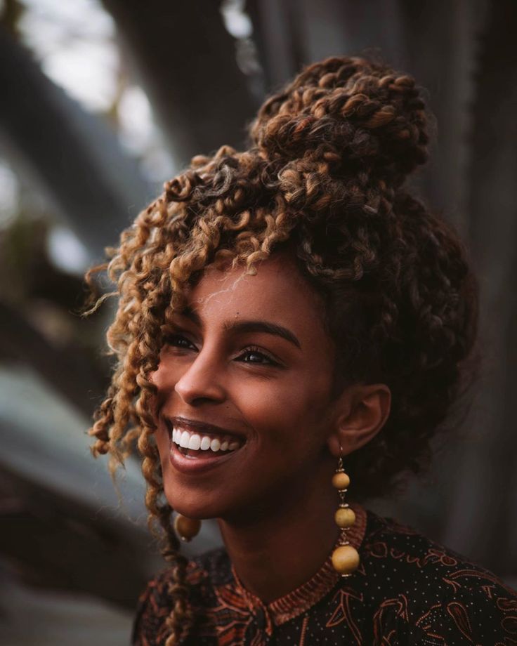 A majestic updo that combines the casual finesse of a spring twist with the opulence of golden accessories. This style represents the perfect amalgamation of elegance and playfulness, ideal for spring twist hairstyles for natural hair.