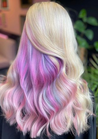 Starting strong, the Vivid Pastel Fusion is a statement of artistic expression for blondes. This daring blend uses highlights of deep purple melting into a softer pink, creating a dynamic contrast against the platinum base. It’s a color that’s both whimsical and sophisticated, perfect for those who wish to add a splash of color to their lives without committing to a full head of unconventional hues.