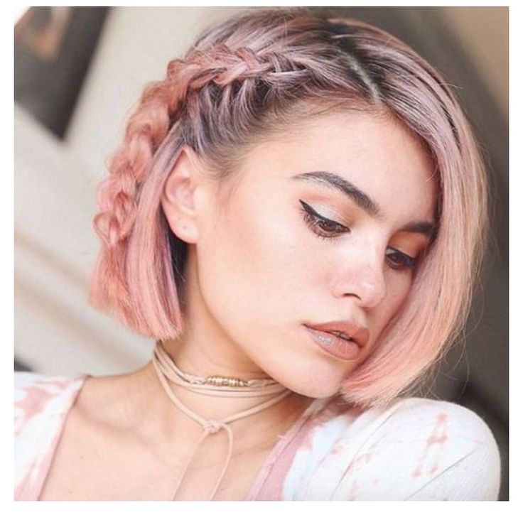 Pastel pink hair is braided along the crown, giving this short bob a touch of whimsy and style. The braid adds texture and interest, creating a playful contrast against the straight, blunt cut, which is a fresh take on summer hairstyles for short hair.