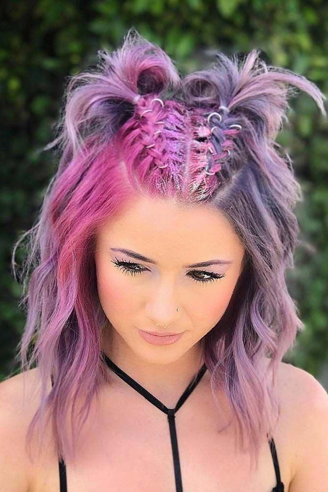 This vibrant hairstyle is a bold celebration of color, featuring shades of purple and pink in a daring pixie cut. The intricate braiding at the top adds an unexpected twist to what could be a simple summer hairstyle for short hair.
