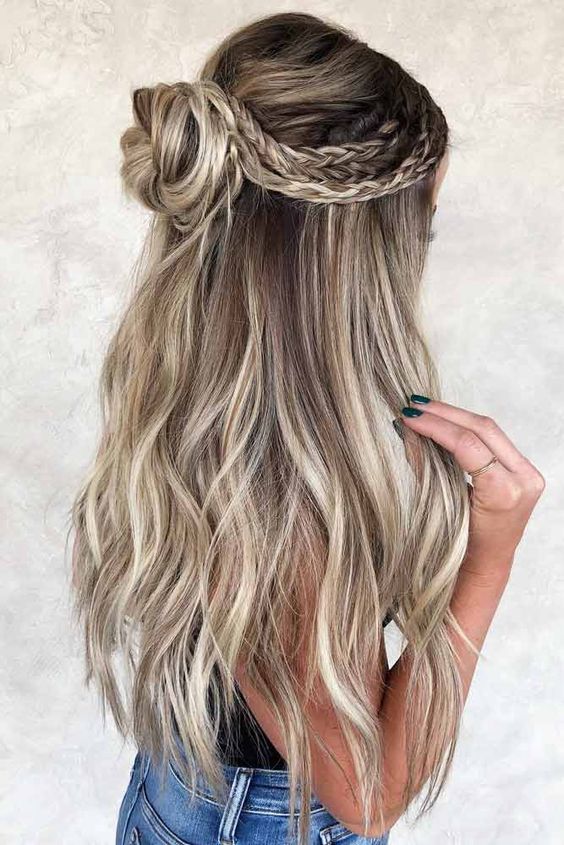 This hairstyle captures the essence of summer with its golden highlights and a relaxed half-up, half-down style. A small braid adds a touch of elegance to the loose waves, embodying the spirit of summer hairstyles for long hair. It’s a look that brings to mind the soft glow of a sunset on the beach.