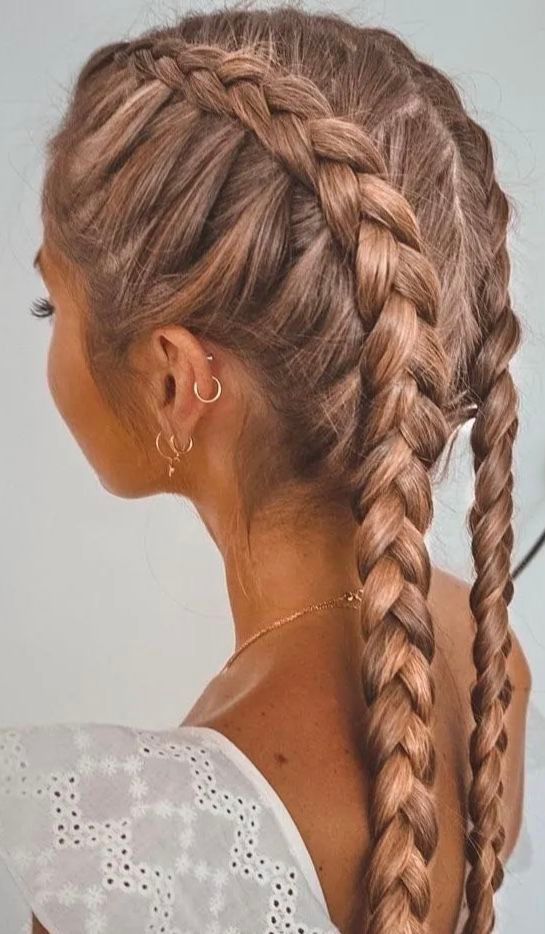 Nothing says summer hairstyles braids like this immaculately plaited duo. This style features two symmetric Dutch braids that are tightly woven from the front to the back, showcasing the skill and precision that goes into creating such a classic look.
