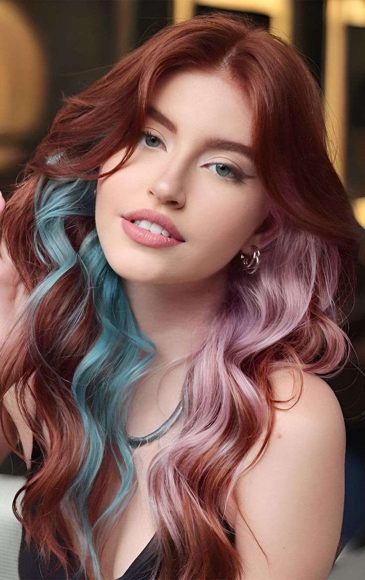 Dive into the depths of summer with this mermaid-inspired look that features a rich, auburn base melting into waves of turquoise and pink. The colors mimic the vibrant hues of the ocean and sunset, making it a standout choice for summer hairstyles for long hair.