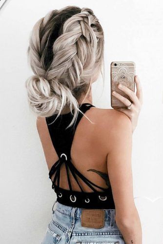 The top knot gets a stylish update with added texture and volume, making it an ideal choice for the urban fashionista. This spring hair style reflects a modern edge, suitable for both short and medium lengths.