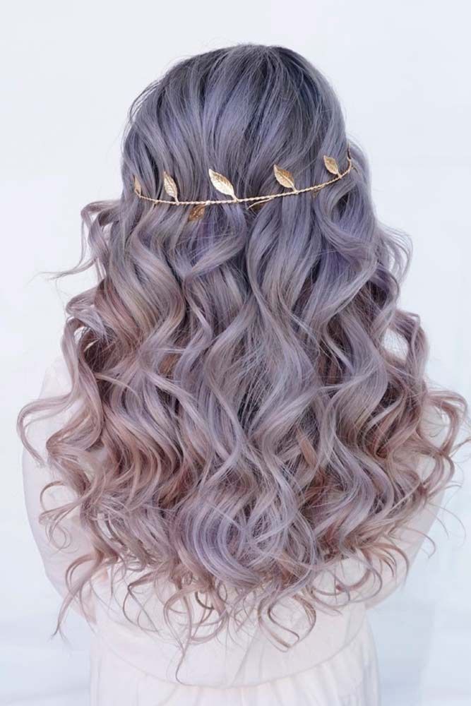 Last on our list is this ethereal style that interweaves lavender tones with a touch of gold, reminiscent of a dreamy summer landscape. The long, wavy locks are adorned with a golden leaf headpiece, adding a mythical quality to the summer blonde hair highlights.