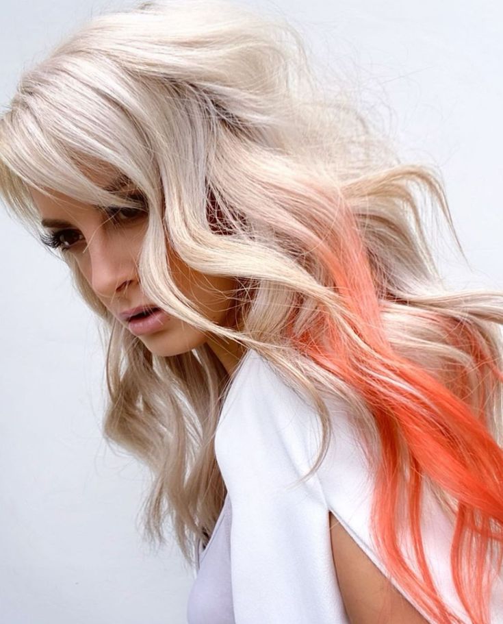 This style is especially suited for those with a natural blonde or lightened base, allowing the vibrant orange to blend seamlessly. To keep this fiery hue from losing its luster, invest in a color-safe shampoo and avoid over-washing.