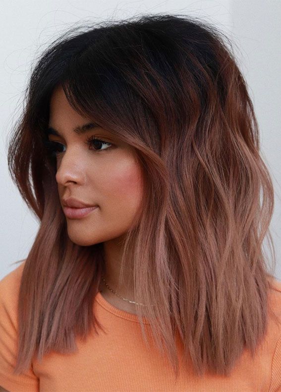 Rosewood is the perfect amalgamation of warm spring hair color brown and a whisper of pink, creating a unique shade that’s both modern and timeless. The soft blush tones are flattering for a variety of skin tones and create an air of understated elegance. This haircolor is ideal for someone looking to add a hint of color without overwhelming their natural beauty. It’s stunning when styled in a tousled bob, adding a playful edge to a classic cut.