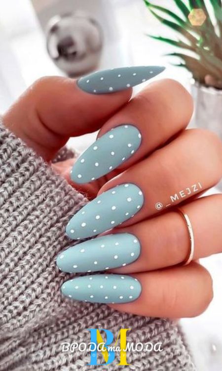 Light blue manicure with a scattering of small white dots creates associations with the spring sky covered with scattered clouds. It is the perfect choice for a light and casual spring-summer look. Combine such a manicure with airy dresses or light blouses – it will add freshness to your style.