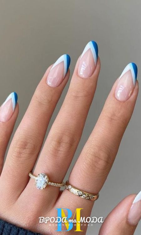 Blue manicure with a geometric design is the embodiment of courage and creativity. Stripes, triangles and other patterns in combination with white and black look especially expressive on long oval nails. This is an ideal option for those who are not afraid to experiment and are ready to express themselves. Combine such a manicure with monochrome clothes so as not to distract attention from your work of art.