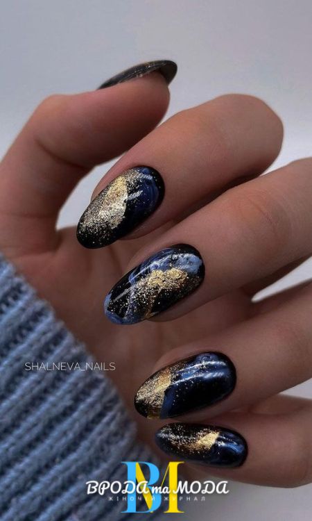 Dark blue nails with patterns reminiscent of the starry sky or distant galaxies create the impression of depth and infinity. This manicure is perfect for evening outings, adding mystery to your look. Try wearing these nails with elegant black or navy outfits for a stylish look.