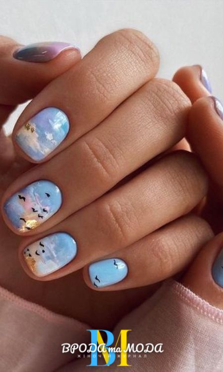 Pastel blue color with thin clouds and gold splashes is the pinnacle of femininity and romance in manicure. This design will be a great addition to a festive or wedding look. The sophistication of such a manicure does not require complex outfits – a simple white dress or blouse will be the perfect background.