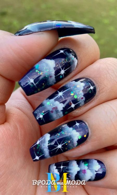 In the evening, I always prefer something mysterious, so dark blue nails with a starry sky pattern are my must-have for an evening out.