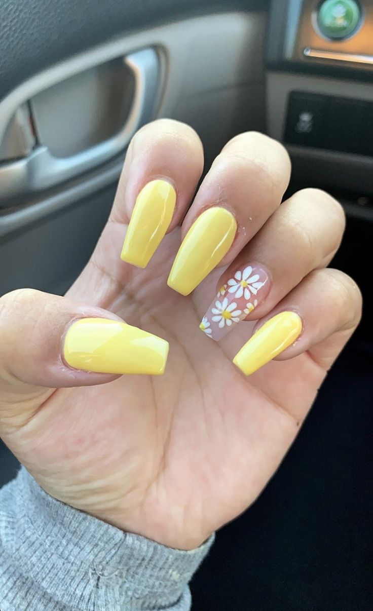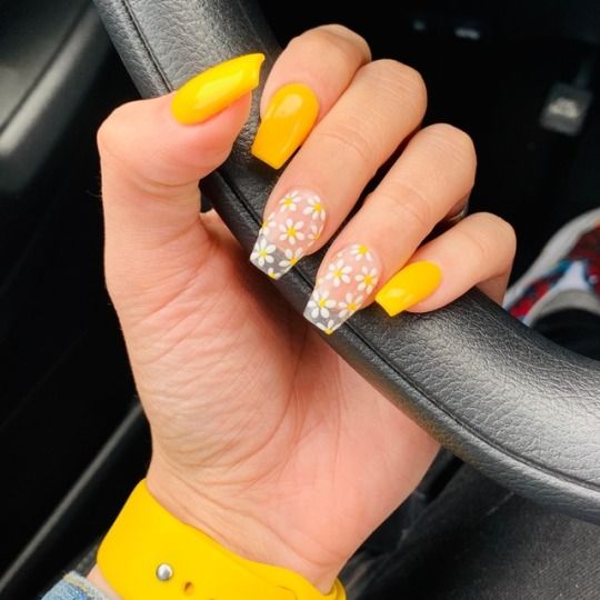 Combining function with fashion, this nail design sees a burst of yellow matched with intricate flower patterns, perfect for the stylish woman on the go. The spring nails yellow and pink accents make for a delightful contrast, echoing the colors of a springtime bloom. This look is for the dynamic woman who balances a busy life with her desire to stay trendy.