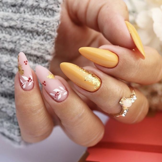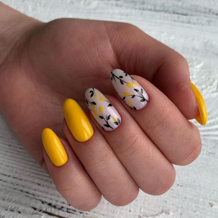Here, the vividness of lemon yellow meets the subtlety of floral designs. The spring nails yellow and green stems of the tiny flowers add a fresh dimension to the look. This design is for the woman who loves to express her personality through her nail art, combining bright color combos with delicate patterns.