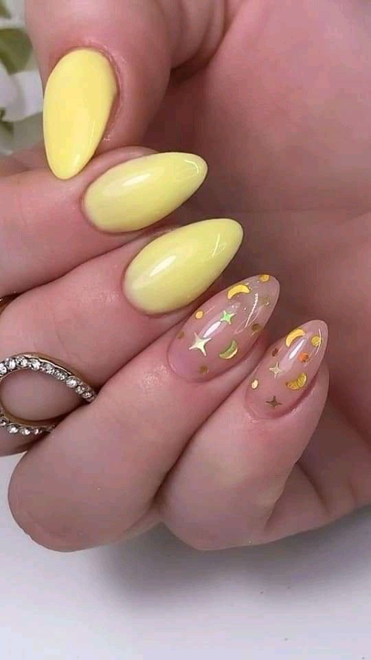 In a design that looks like it was kissed by starlight, we see a combination of sheer polish and yellow, adorned with small stars and moons. This whimsical approach to spring nails yellow color combos invites a touch of the celestial into your daily life. It’s ideal for the dreamers and the romantics, adding an element of fantasy to the everyday.
