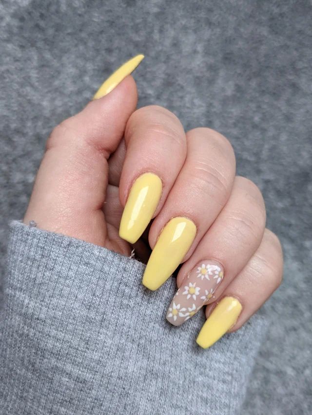 Florals for spring are not groundbreaking, but when they’re paired with a bright yellow background, they become a statement. These nails feature an array of spring nails yellow flowers, offering a bouquet at your fingertips. The design is intricate and lively, perfect for the woman who carries the essence of a garden wherever she goes.