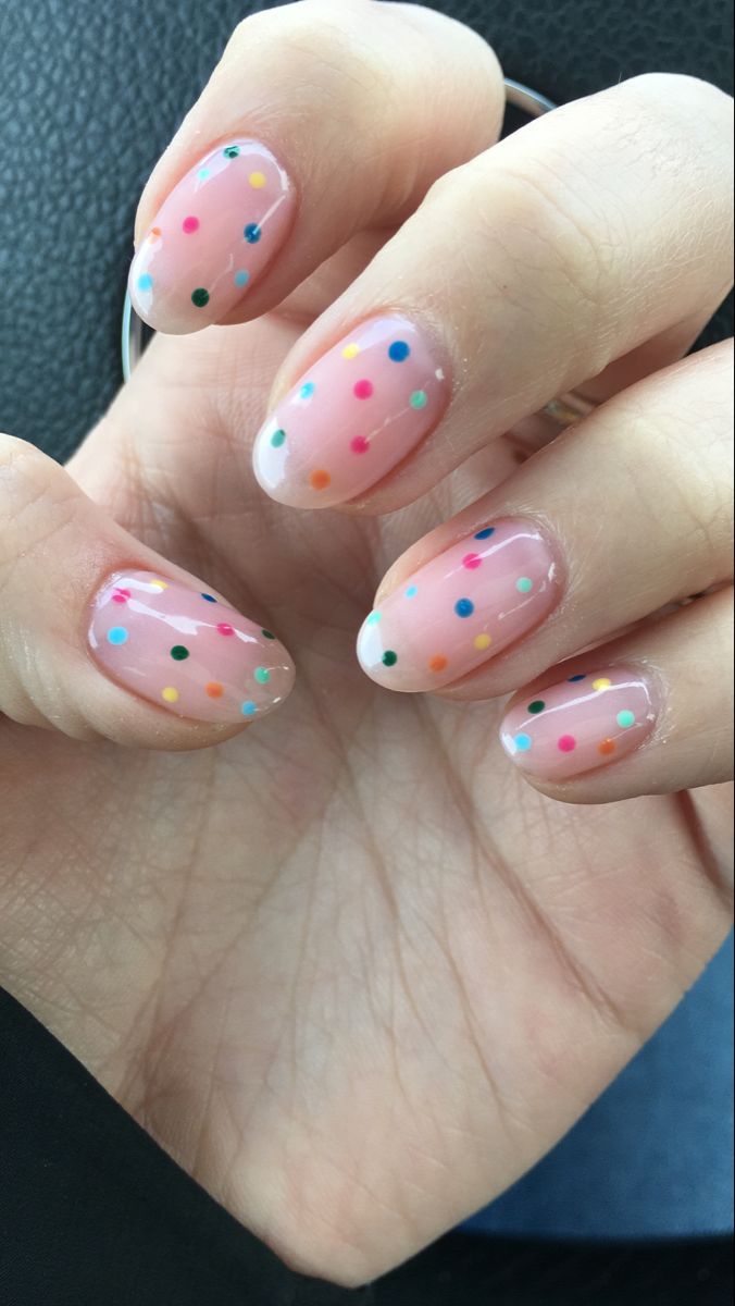 Dots are delightful, especially when they’re as colorful as a springtime meadow. This design is a cheerful nod to the spring rainbow tip nails, perfect for anyone with a love for fun and a flair for the dramatic.