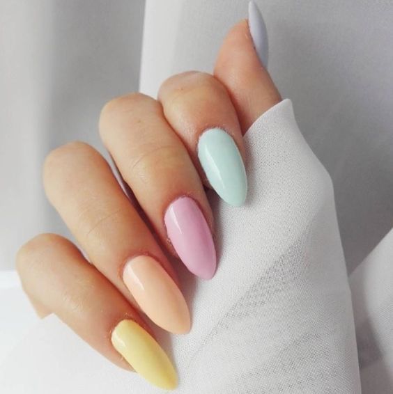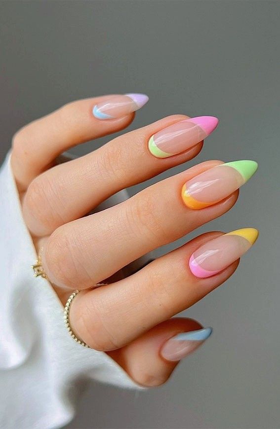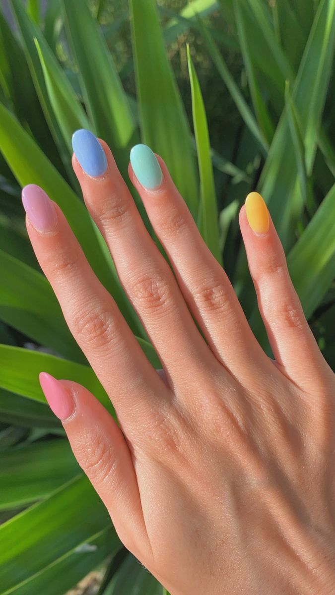 Almond nails in a pastel rainbow gradient are the epitome of elegance. The smooth transition of colors captures the spring nails rainbow pastel aesthetic, ideal for anyone looking to blend subtlety with the season’s vibrancy.