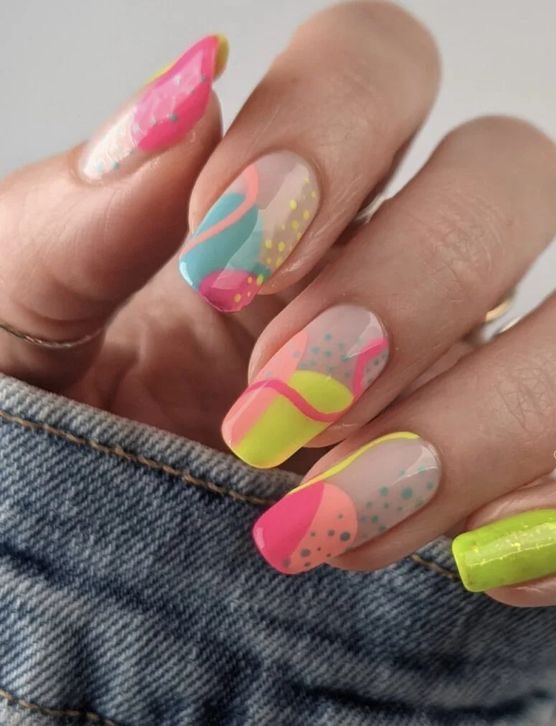 Bold and playful, these nails are a canvas of abstract wonders, reminiscent of a springtime carnival. The whimsical shapes in bright, contrasting colors make for a statement look that fits perfectly with the cute spring nails rainbow trend, bound to turn heads and spark conversations.