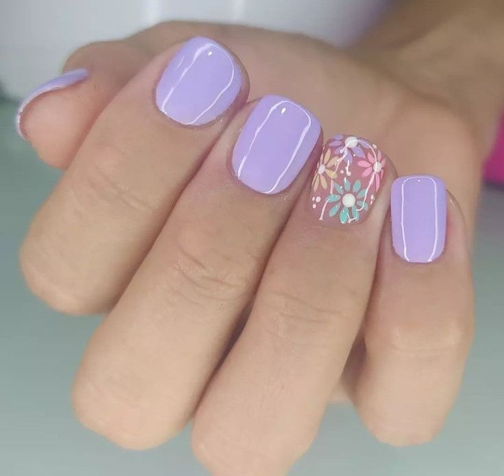 Lavender fields are a springtime fantasy, and wearing this color on your nails is like carrying a piece of that dream with you. The spring acrylic nails rainbow design here features a single nail with a delicate floral pattern that’s reminiscent of a blooming garden, an ode to the season’s natural beauty.
