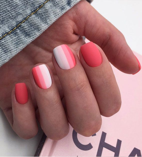 Coral is the quintessence of spring and incorporating it into your nail art with a modern twist can be simply captivating. A single striped accent in a paler shade adds dimension and character to the otherwise solid coral nails. This design embodies spring break nails rainbow energy without being overpowering.