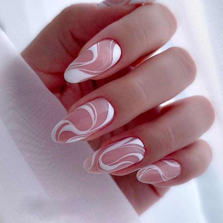 The embodiment of grace, these summer nails oval french take a modern spin on the classic French tip with swirls of white and pink, creating an ethereal marble effect. The negative space and the seamless swirls give the illusion of movement, perfect for a sophisticated summer look.