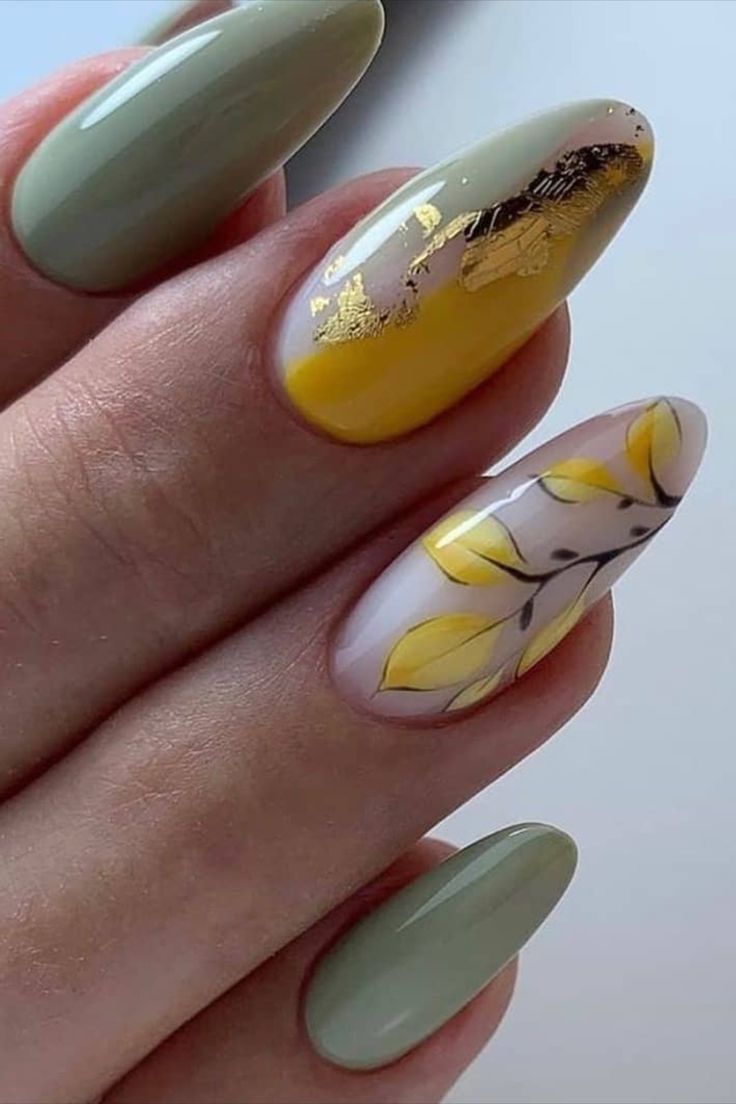 Prime your nails with a base coat. Apply the yellow polish on the thumb and middle finger, and sage green on the others. On the accent nail, use a fine brush to create floral designs, then gently add gold leaf pieces. Finish with a durable top coat to encapsulate the vibrancy and detail of this design.