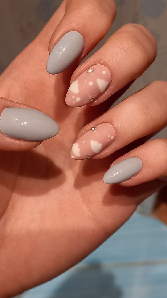 Begin with a base coat to prep the nails. Paint a matte mauve base, and then, with a dotting tool, add white heart patterns. Add a small dot of clear polish where you want the rhinestones, and place them carefully. Finish with a matte top coat to set the entire look.
